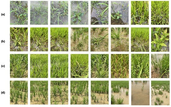 We conducted a total of three data collection sessions. The first session took place at Zoomlion Smart Agriculture Base in Yuelu on 22 April 2024, under cloudy weather conditions, with the rice plants in the seedling stage. The second session was carried out at Yingchang Agriculture Base in Liuyang on 27 April 2024, under overcast conditions that later turned to light rain, with the rice plants in the tillering stage. The third session was conducted again at Zoomlion Smart Agriculture Base in Yuelu on 17 May 2024, under clear skies with intense sunlight, with the rice plants in the jointing stage. The images captured during these three sessions across the two locations encompass different growth stages of rice, as well as various species and distributions of weeds, along with diverse lighting conditions under different weather scenarios. Furthermore, the randomness of data distribution, varying degrees of occlusion, weed density, and different scales of photography were also considered. These measures could enhance the representativeness and generalizability of the dataset.