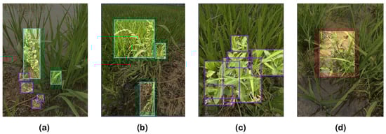 Examples of the dataset annotation process. In the figure, green boxes represent BS, red boxes represent PL, and purple boxes represent AS. (a) demonstrates the annotation method for cases where multiple types of weeds are present in the image; (b,c) illustrate the annotation approach for scenarios with densely distributed weeds; (d) shows the annotation method for cases where weeds are partially occluded.