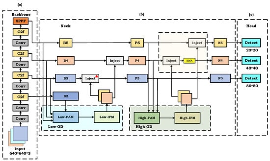 GE-YOLO network structure, where (a) shows the Backbone structure, Conv represents a standard convolution operation, and C2f is a specialized feature extraction module unique to the YOLOv8 architecture. (b) shows the Neck structure, composed of Gold-YOLO and the EMA attention mechanism. The Low-GD module, consisting of Low-FAM and Low-IFM, aggregates and distributes low-level features from different scales of the backbone (, , , ). The High-GD module, comprising High-FAM and High-IFM, aggregates and distributes high-level features from different scales (, , ). (c) shows the Head structure. In the figure, black numbers like 640*640*3 and 20*20 indicate the dimensions of the input image and the feature maps used for detection, while the light yellow regions highlight the insertion points of the EMA attention mechanism.The Inject module marked with a red triangle will be the object introduced in Section 2.2.2.