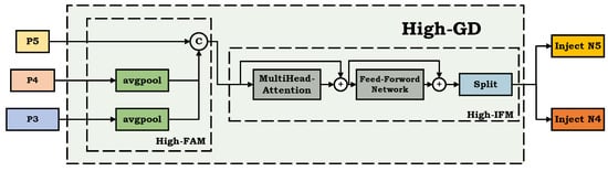 Low-GD’s primary function is to efficiently aggregate and fuse low-level feature maps of varying sizes. It mainly consists of two parts: Low-FAM (feature alignment module) and Low-IFM(information fusion module). The Low-FAM module scales the feature maps to a uniform size and performs channel concatenation. This approach ensures efficient information aggregation while minimizing the computational complexity during subsequent processing by the transformer module. When choosing the alignment size, two opposing factors need to be considered: (1) Maximizing the retention of low-level features, as they contain more detailed information; (2) increasing feature map size inevitably raises computational complexity. To balance accuracy and detection efficiency, is chosen as the unified alignment size. Feature maps larger than are downsampled to size using global average pooling, while feature maps smaller than , like , are upsampled to size using bilinear interpolation. Finally, these feature maps are concatenated along the channel dimension to obtain the output feature . The formula is described as follows: