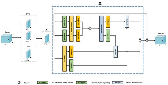 Traditional conventional channel and spatial attention mechanisms have demonstrated significant efficacy in enhancing the discriminative power of feature representations. However, they often bring side effects in extracting deep visual representations due to channel dimensionality reduction when modeling cross-channel relationships. To address this issue, Daliang Ouyang, Su He, Jian Zhan, and others proposed the EMA attention mechanism [26]. This attention mechanism rearranges some channels into multiple batches and groups the channel dimensions into multiple sub-features, ensuring that spatial semantic features are well distributed within each feature group while reducing computation overhead. The architecture of the EMA attention mechanism is depicted in Figure 8, where h denotes the image height, w indicates the image width, c represents the number of channels, and g signifies the channel grouping.