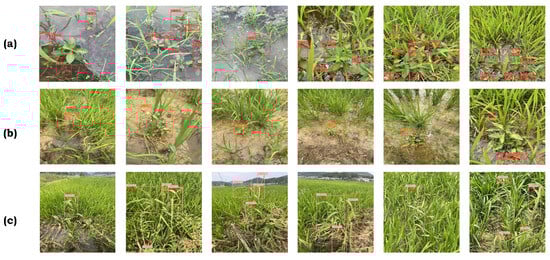 The original images had a resolution of 3024 × 4032 pixels. A total of 995 images were captured: 126 from Yingchang Agriculture Base in Liuyang and 869 from Zoomlion Smart Agriculture Base in Yuelu. These images include three common types of weeds found in the Hunan region: Beckmannia syzigachne, Alternanthera sessilis, and Polygonum lapathifolium. Some sample images from the dataset are shown in Figure 2. The data were further screened, classified, and annotated with the guidance of agricultural experts.