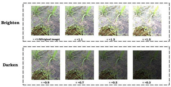 Here, represents the pixel value of the original image at position . The illumination factor is used to adjust the brightness, where indicates an increase in brightness, indicates a decrease in brightness, and means no change in brightness. represents the pixel value of the adjusted image at position . Images under different illuminations are shown as Figure 10.