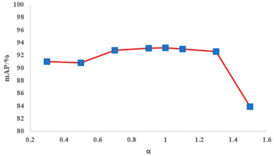We set multiple values of and obtained a series of test results as shown in Figure 11. It can be observed that our model remains stable when is within the range of 0.3 to 1.1, with the mAP value consistently above 90%. Although as increases further, the mAP value gradually declines, but it is still above 82%. This indicates that our model has good resistance to low light and moderate bright light conditions, demonstrating strong generalization performance.