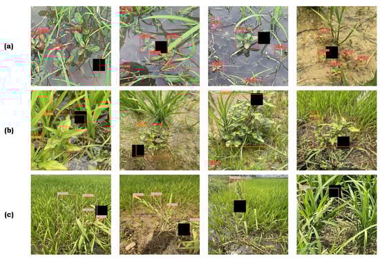 In actual rice paddy environments, the distribution of weeds is often irregular and mixed with crops, resulting in common occurrences of occlusion between crops and weeds, as well as between different weeds. Therefore, to address this issue and evaluate the generalization performance of our model under occlusion conditions, we further processed the dataset by artificially creating occlusion regions on the original images. Occluded images and some of the resulting detection results are shown in Figure 12.