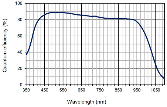The key sensing element is the PS100-6b photodiode (TE Connectivity https://eu.mouser.com/datasheet/2/418/9/PS100_6_THD_3001054-3304769.pdf, accessed date: 2 March 2025). It features a 10 mm × 10 mm light-collecting area and, according to the manufacturer’s specifications, achieves up to 90% quantum efficiency with a low dark current. Table 1 presents the main device parameters taken directly from the datasheet, while Figure 1 shows the typical spectral sensitivity as provided by the manufacturer.