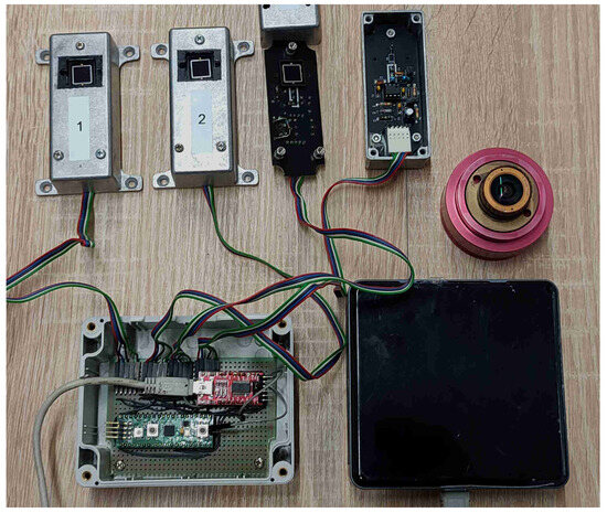 The entire system, including the photodiode modules, camera, all electronics, and Intel NUC, was housed in a specially constructed box. This box is equipped with a system for ventilating and heating the components to prevent dew from settling on the components. It also has a large window made of BK-7 glass, allowing light to reach both the photodiodes and the camera. The small housings for the individual diode modules have also windows (BK-7 glass) of about 20 mm × 20 mm through, which light can reach a photodiode. All four modules and the camera are placed horizontally, with the camera and photodiodes directed to the zenith. The system with the main elements extracted from the housing and opened to reveal the interiors is presented in Figure 2.