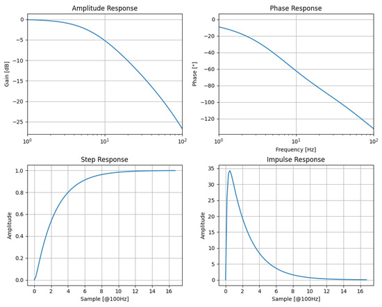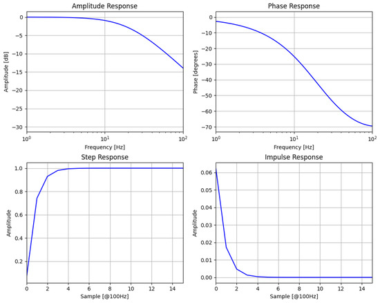 This filter acts as a discrete equivalent of a first-order RC low-pass filter. The parameter a is equivalent to the time constant of the filter—the smaller the value of a, the longer the time constant. The choice of the parameter a involved some compromise in the system. Smaller values of a resulted in lower noise of the recorded waveform at the price of a slower step response, while larger values of a gave a faster step response with higher noise. We selected a value of 1/16, which does not disturb the signals (its cutoff 3 dB frequency is about 20 Hz while it is 7 Hz for analog antialiasing filter) while reduce mainly gaussian and 50 Hz noise before sending data to PC. The samples from these filters are decimated by 20 to have a final rate of 100 Hz. The value of 100 Hz allowed us to send all the required information from the module at the maximal speed of RS232 port—115.2 kbps. It appeared to be also satisfactory from the point of view of the observed phenomena and their dynamics. An additional advantage of this filter is that the output data samples are float numbers instead of 12-bit numbers (with 1.22 mV resolution), as received from the A/D unit. The characteristics and responses of this filter are given in Figure 6. For the consistency with the characteristics of Sallen–Key filter, we used presentation of both step and impulse response in the resulting sampling 100 Hz instead of the initial sampling rate of 2000 Hz.