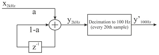 The output signal from the low-pass Sallen–Key filter is connected to the input of an A/D converter in the ADuC7020 microcontroller. The converter multiplexedly samples successive channels at a rate of 8 ksps and a resolution of 12 bits. Effectively, each channel is thus sampled at a rate of 2000 Hz with a resolution of 1.22 mV. The sampled signal is filtered with digital filter of IIR type (infinite impulse response). The role of this filter (in contrast to Sallen–Key which is antialiasing filter) is the reduction of noise associated with the A/D conversions and increasing measurement resolution (smoothing the final signal). The first-order IIR can be described by the following differential equation and the schematic of the IIR filter algorithm is given in Figure 5.