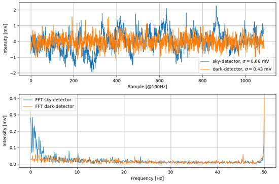 To verify the noise level under real-world conditions, one photodiode was fully shielded from light, allowing us to capture the system’s inherent noise. A 10-s segment from sample night observations was chosen for the noise power analysis. During this time, the signals on the light-detecting diodes were least noisy, i.e., devoid of any abrupt brightness spikes that could arise from various external sources. We also selected the best possible night, without moonlight and with very good visual transparency. Therefore, we can treat this sample series as good example of recording with minimal ambient noise. The RMS values were compared for the diode observing the sky (one of three diodes—all showed very similar signals) and for the diode with the light access blocked. The time series and the corresponding spectra are presented in Figure 7. The mean value of both signals was removed before plotting.