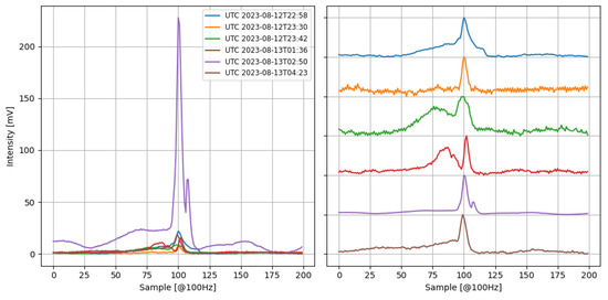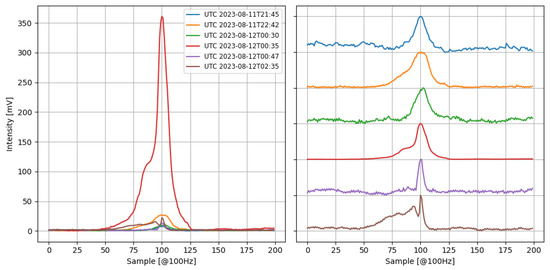 In Figure 8 and Figure 9, a substantial brightness difference is apparent between the brightest and faintest detections, reaching a factor of 50 or more. The brightest meteors show a peak amplitude that is several hundreds times greater than the noise level, indicating significant dynamics of the phenomena observed the proposed way. The shapes of the waveforms vary; some increase slowly, reaching a maximum, then decrease rapidly, while others are symmetrical around the peak or present even the opposite character.