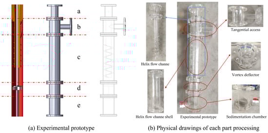 To facilitate clear the observation of the experimental phenomena in the in situ spiral-cyclone separator, the separator is made of high-strength Plexiglas (acrylic). Figure 2b shows the experimental prototype machining of the components; due to the separator using a split design, the geometric optimization only needs to be processed separately in the spiral flow channel, vortex deflector, cyclone inlet, separator shell, and sedimentation chamber. The other parts do not need to change, and components that need to be optimized can be replaced.