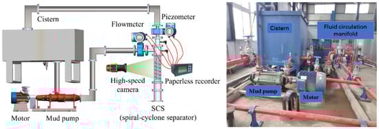 The experimental prototype is designed as a detachable modular integrated structure to facilitate model optimization and modification. The experimental system is a closed loop of liquid and solid stream flow. It consists of a reservoir, slurry pump, drive motor, spiral-cyclone separator, flowmeter, experimental stand, pressure transducer, and paperless recorder, as shown in Figure 3. The mixed slurry of liquid and solid particles in the hydrate substitution sample is simultaneously fed to the suction pipe of the screw pump located below the storage tank. The control of the liquid flow can be achieved by changing the rotational speed of the motor driving the pump, which is designed for a flow rate of 25 m3/h and a volume concentration of the solid stream between 5% and 15%. The solid particles are added from the top of the storage tank and dropped by gravity to the bottom of the liquid storage tank. The solids and liquid mix with each other along the suction port before reaching the pump inlet. The suction port is provided with a solid–liquid mixed fluid sampling port, and the solid–liquid mixed fluid is transported from the pump outlet to the separator inlet through a 140 mm diameter pipe. The separator is vertically mounted, and the mixed slurry enters the separator tangentially at its upper part. The separator has a transparent plexiglass housing and a separated solids reservoir at the bottom.