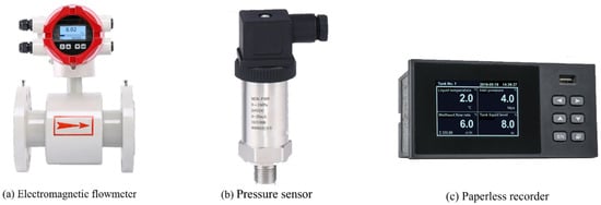 Data detection units mainly include electromagnetic flowmeters, pressure sensors, and a paperless recorder. As shown in Figure 4a, the electromagnetic flowmeter is an intelligent display type manufactured by Hangzhou Meikong Automation Technology Co., Ltd., Hangzhou, China. with a flange installation method. The electromagnetic flowmeter can output a 4–20 mA signal, and the electromagnetic flowmeter output data can be directly transmitted to the paperless recorder.