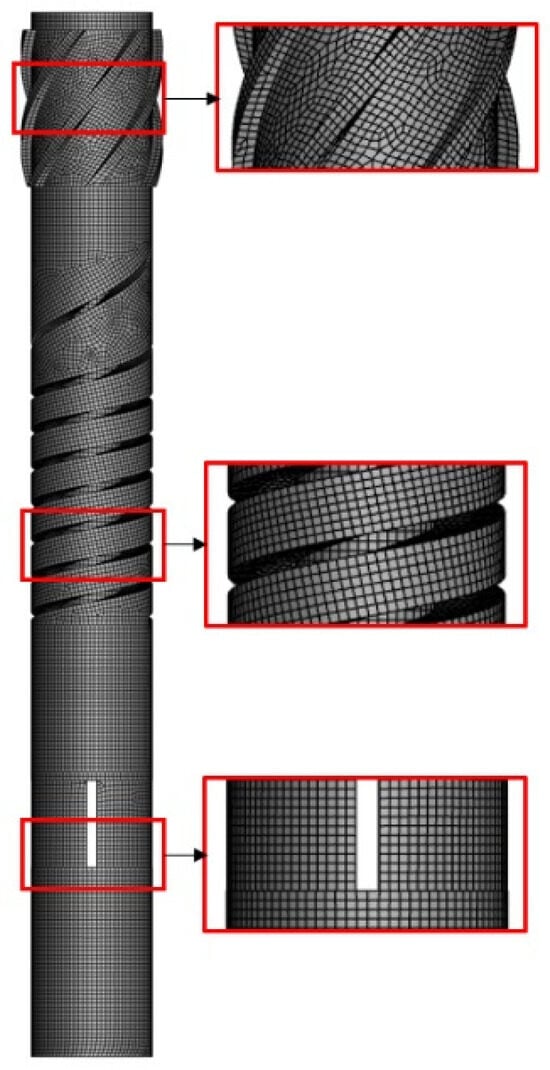 A screw-cyclone coupling in situ separator usually works in a turbulent state when the centrifugal separation of the multi-phase flow is carried out. There are many turbulence models to choose when flow field simulation is carried out. The Euler–Euler method is mainly used in cases where the volume fraction of the dispersed phase is less than 10% []. The model is suitable for the simulation of a fully turbulent flow process []. Large eddy simulation can provide a good prediction of multi-phase flow turbulence, but compared with other methods, it requires higher computing resources. The Reynolds stress model has a good prediction ability for the turbulent flow field of a hydrocyclone []. RSM can predict anisotropic turbulence and capture the high swirl fluctuation of a curved boundary []. Since the real flow in the spiral-cyclone separator for natural gas hydrate is an unsteady and complex three-dimensional turbulent motion, the numerical simulation analysis of the separator in this paper adopts the Reynolds stress model. The hexahedral mesh was chosen to reduce computational errors, as it better captures the parameter gradient changes inside the separator. To improve computational accuracy, local mesh refinement is applied to the model, as shown in Figure 5.