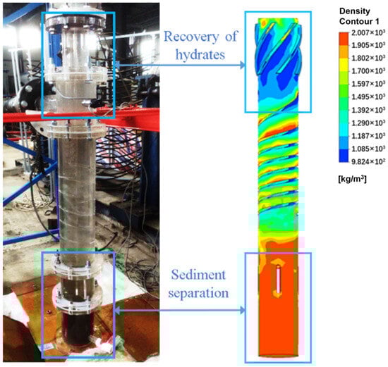 As shown in Figure 6, the experimental phenomenon of the overall separation process of the spiral-cyclone separator is compared with the simulation results. From the experimental phenomenon of the spiral-cyclone separator, we can find the difference in the transparency of the liquid in the hydrate recovery area and the sediment separation area, which is caused by the difference in the volume fraction of the sediment phase. The experimental phenomenon can prove that the separator has the same separation effect as the numerical simulation from a macroscopic point of view, while the quantitative analysis of the separation efficiency of the separator needs to be determined by sampling the outlet and inlet fluids.
