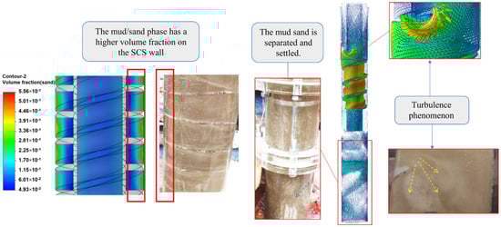 As shown in Figure 7, by comparing the numerical simulation and the indoor experimental phenomena, it was found that the volume fraction of the sediment phase is higher at the wall of the separator, which is because the denser sediment is thrown to the wall of the separator under the action of the centrifugal force generated by the separator, and the separation of the hydrate and sediment is achieved. The phenomenon of violent turbulence occurs at the entrance of the spiral flow channel so that the multiphase mixed slurry to be separated obtains a greater disturbance, which is conducive to the subsequent separation of the mud and sand from the multiphase mixed slurry. At the same time, at the bottom of the separator, a large amount of sedimentation of mud and sand occurred, which verified that the designed model has a good performance in terms of separating mud and sand.
