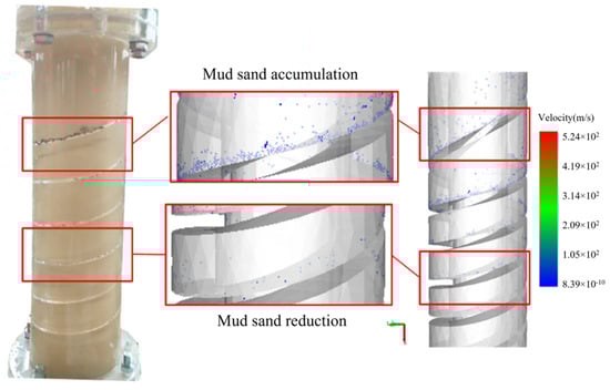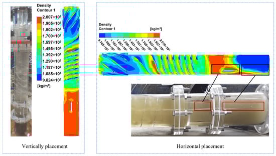 Large particles are more obvious in the separation by gravity. In order to study the impact of large sand particles on the separation effect of the separator, in the actual experimental process in addition to the addition of quartz sand, but also in the circulating water tank, a small amount of large sand particles, with a particle size of about 1 mm, was added. As shown in Figure 13, when the separator was placed vertically, the experimental results and the simulation cloud showed that the sand was separated and settled to the bottom of the separator. When the separator was placed parallel to the ground, a unilateral accumulation of sediment was formed due to the influence of gravity, but the location of the sediment accumulation was also at the bottom of the separator. Therefore, the above two cases show that the separator exhibits good performance in separating mud and sand in different operating postures.