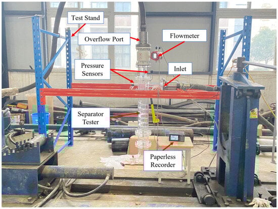 The pressure transmitter, shown in Figure 4b, is also from Hangzhou Meikong Automation Technology Co., Ltd., Hangzhou, China. with the pressure data collection points on the separator pre-machined with threads for the direct connection of the pressure sensors at the inlet and outlet of the separator to measure real-time pressure inside the separator. The paperless recorder, as shown in Figure 4c, is the HR1000 series from Beijing Huake Yi Technology Co., Ltd., Beijing, China. used to record pressure and flow parameters during the experiment. The signals collected by the recorder are processed using the DMR post-processing software. The DMR 3.12.0 software works by processing input data that typically include high-frequency measurements of system parameters. The input data are analyzed using advanced signal processing algorithms and machine learning models to identify patterns, trends, or anomalies. The output data include processed results, such as predictions, diagnostic insights, or optimized parameters, which support decision-making processes.
