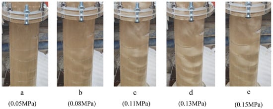 To verify the accuracy of the model, the pressure drop results from the separator’s numerical simulation were compared with the experimental data. The experiment used the WLA-3A controller to adjust the inlet pressure and flow rate. As shown in Figure 9, clean water was slowly injected into the separator at a low flow rate until all of the air was expelled and the separator was filled with water. During the experiment, the valve opening was adjusted every 2 min, and the changes in the outlet pressure caused by variations in the inlet pressure and flow rate were recorded. The changes in the separator’s outlet pressure are shown in Table 3. As the inlet pressure varied (a–e), different degrees of turbulence were observed in the separator’s spiral channel, as seen in Figure 10. In the numerical simulation, velocity boundary conditions were applied, and the inlet velocity in Table 4 was calculated by dividing the experimental flow rate by the separator’s inlet area (0.0162 m2).