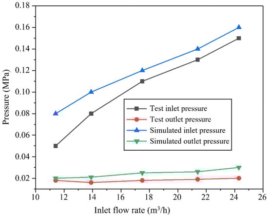 Due to experimental limitations, the separator could not operate under the actual conditions of solid-state fluidized mining. Therefore, the numerical simulation boundary conditions were set to match the experimental setup (see Table 3) for the calculations, and the simulation results were compared with the experimental data for validation. The pressure drop curves from both the experiment and the simulation are shown in Figure 11.