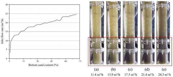 At a certain inlet area of the separator, the greater the inlet flow rate of the separator the greater the inlet velocity of the fluid. Figure 12 shows the phenomenon of increasing inlet flow rate separator changes in presented as a graph. Figure 12a–e for five different inlet flows under the separator’s work situation site photos. As the flow rate increases, the sand content at the bottom of the separator gradually increases, the mud and sand separation region begins to move up, and the mud and sand settling region at the bottom shows different degrees of mud and sand accumulation.