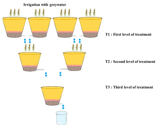 The process consists of seven pots that have been arranged in a cascade (staircase) to ensure 3 levels of graywater treatment, allowing the irrigation of quinoa with 3 qualities of water (GWT1: graywater drained from the first treatment; GWT2: graywater drained from the second treatment; and GWT3: graywater drained from the third treatment). The plastic pots have a diameter of 32 cm and a height of 30 cm. Every pot features an aperture to let drainage water escape and a gravel bed at the bottom. A geotextile filter is placed on top of a 3 cm thick layer of gravel in each pot to filter the drained water. This thickness and the usage of geotextile to enable proper water drainage have been made possible by preliminary testing. A 25 cm thick layer of soil weighing 20 kg sits on top of this gravel layer.