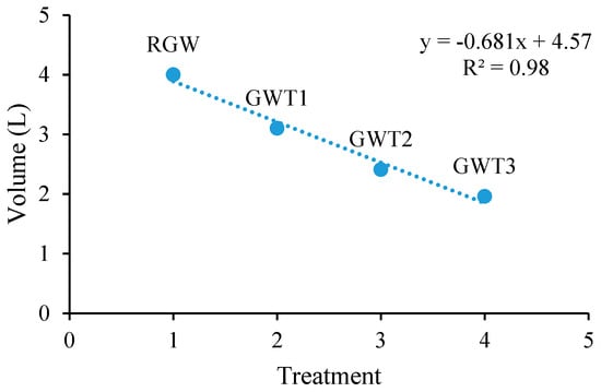 Correlation between graywater volumes and treatment. RGW: raw graywater; GWT1: graywater drained from the first treatment; GWT2: graywater drained from the second treatment; and GWT3: graywater drained from the third treatment.