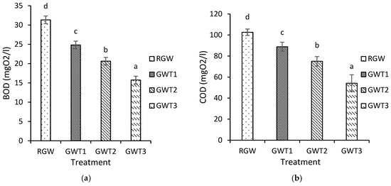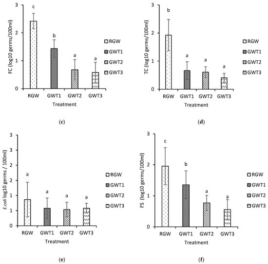 Variation in biological parameters and microbiological water quality of graywater depending on the treatment. (a) BOD; (b) COD; (c) fecal coliforms (FC); (d) total coliforms (TC); (e) E. coli; (f) fecal streptococci (FS); RGW—raw graywater; GWT1: graywater drained from the first treatment; GWT2: graywater drained from the second treatment; and GWT3: graywater drained from the third treatment.