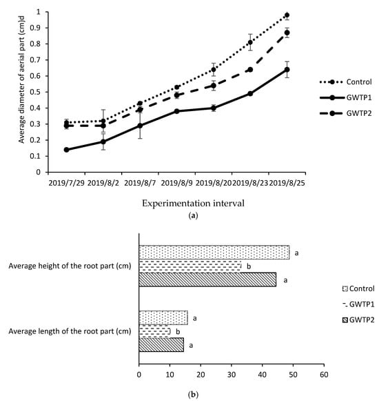 The results show a significant decrease in the average diameter of quinoa plants irrigated with graywater (GWTP1 and GWTP2) compared to the control (Figure 5). The average diameters were 0.58, 0.50, and 0.36 for the control, GWTP1, and GWTP2, respectively. The average plant lengths were 48.73, 44.41, and 33.07, and root lengths were 15.73, 14.46, and 10.09 for the control, GWTP1, and GWTP2, respectively. Graywater irrigation caused a 26% and 30% decrease in aerial and root lengths, with a significant decrease in GWTP2.
