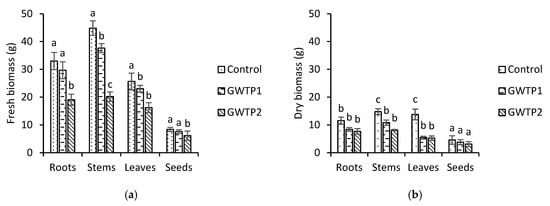 Irrigation with graywater significantly impacted the fresh (FB) and dry biomass (DB) of quinoa organs. The control plants exhibited the highest fresh biomass compared to those irrigated with treated graywater (GWTP1 and GWTP2) (Figure 6). For fresh biomass, reductions of approximately 32% in roots, 55% in stems, 37% in leaves, and 27% in seeds were observed in quinoa plants irrigated with treated graywater. Comparable reductions of 33%, 45%,62%, and 32%, respectively, were recorded for the corresponding dry biomass when comparing irrigation with RGW to treated graywater.