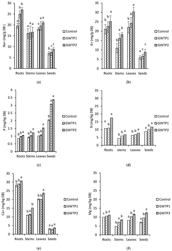Evaluated parameters concentrations variation in roots, stems, leaves, and seeds of quinoa. (a) Na+; (b) K+; (c) P; (d) N; (e) Ca2+; (f) (Mg2+).