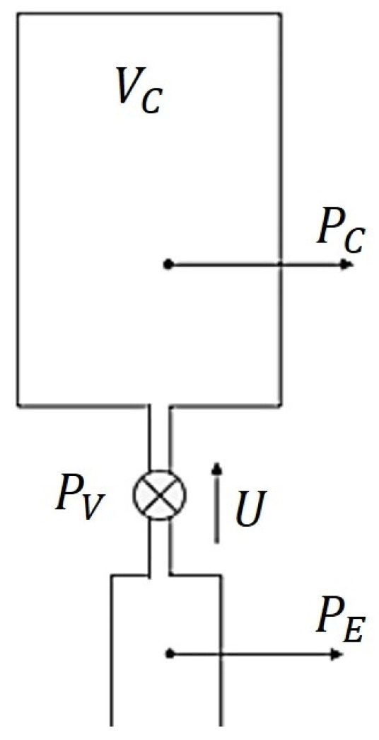 According to the electro-acoustic analogies shown in the table above and the physical problem under consideration, the pressure in the resonator, , is analogous to the total voltage or source voltage, . Similarly, the pressure in the capacitor corresponds to the capacitor voltage and the pressure in the valve, , is analogous to the resistor voltage . On the other hand, the analogue to the volume flow rate, , is the circuit current, . This results in Equation (2) and the corresponding electrical model shown in Figure 3.