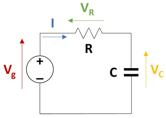 Electric RC load, where VC, Vg, and VR are the voltages at the capacitor, the source, and the resistor and I is the current though the circuit.