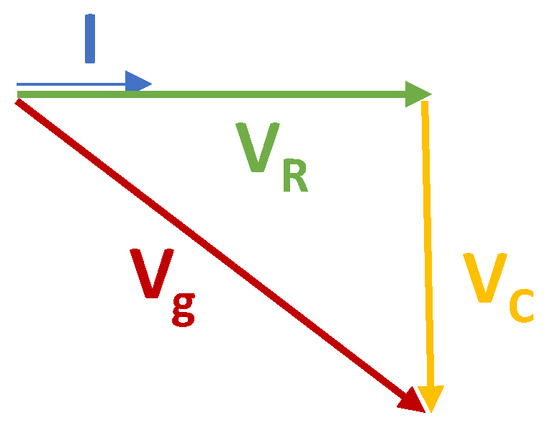 The phasor of a number in polar form is expressed by its magnitude and phase, such that , , and are the phasors, expressed in polar form, of the current, the voltage across the resistor, and the voltage across the capacitor, respectively. As the circuit is in series, considering the current as the phase reference, the voltage at the terminals of the resistor will be in phase with the current passing through it, and the voltage at the capacitor will be delayed by with respect to the same current, as illustrated in the phasor diagram in Figure 4.