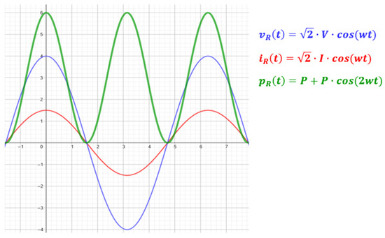 In this case, the instantaneous power to be measured and calculated is that of the resistive element of the circuit, where the voltage at the terminals of the resistor and the current flowing through it are in phase. Figure 5 shows a singular case of the voltage and current in a resistive element, as well as the instantaneous power.