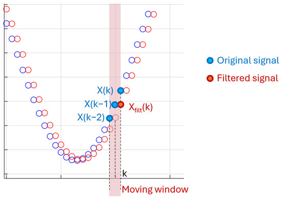 As shown in Figure 8, this filtering technique causes some delay in the filtered signal compared to the original one and, therefore, the size of the moving windows needs to be selected as a trade-off between the noise reduction and the admissible delay.