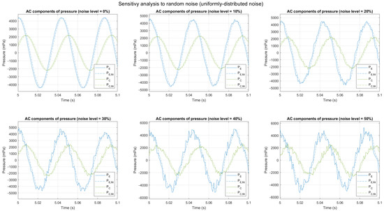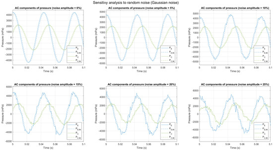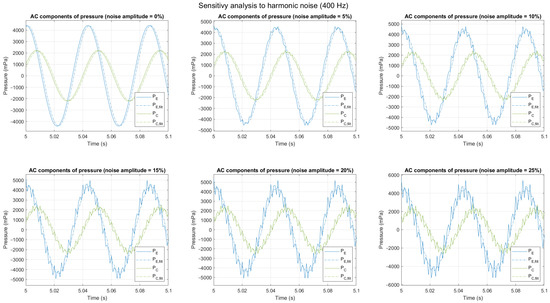 AC component of and , filtered and non-filtered, with different noise levels (harmonic noise, 400 Hz).