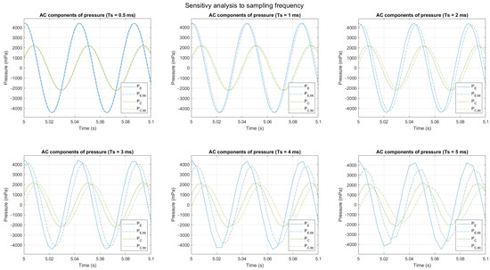 For this analysis, the functions and have been used as in Equations (29) and (30), but the sampling time is swept between 0.1 ms and 5 ms. As a reference, both and have a period equal to 43.1 ms.