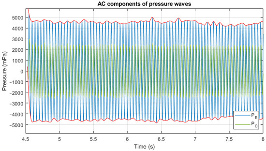 First, the acoustic pressure wave and the average pressure value need to be split up. Alternatively, expressing this idea with electrical terms, the alternating current (AC) wave and the DC operation point need to be separated. To do so, the DC component of cycle c is calculated based on the maximum and minimum values of the signal in cycle c − 1: