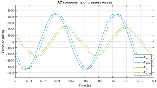 AC component of and : non-filtered and filtered for measured signals.