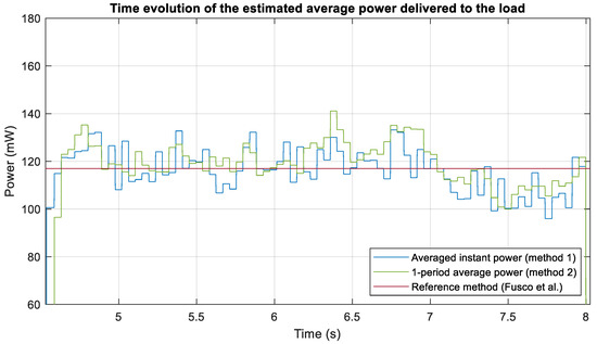 - First, simulated values of and with no noise and a good sampling frequency are considered. The average power delivered to the load is calculated using the proposed methods and compared to the results obtained with the reference procedure [17].