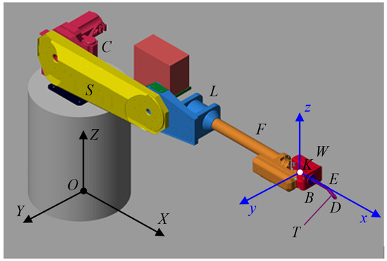 Such a manipulator has six angular DOF, which are provided by six kinematic rotational pairs of the fifth class (see Figure 1): the rotation of the column (C) occurs around the vertical axis at an angle , the rotation of the arm (S) and elbow (L)—around the horizontal axes at angles and , the rotation of the forearm (F)—around its longitudinal axis at an angle , and the rotation of the wrist (W)—around the axis transverse to the forearm at an angle . Finally, the rotation of the gripper (B) is performed around its longitudinal axis at an angle of . The working tool (T) is fixed in the gripper.