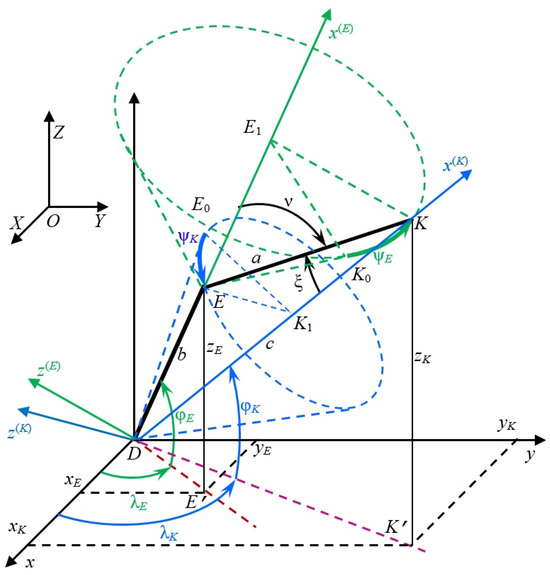 It is convenient to represent the orientation of the main and backup CSs introduced above by three angles; two of them are the angles of the geographic CS (latitude , longitude ) and the third is an additional angle of its own rotation around the abscissa axis. Thus, the main CS has the letter E as an index in the designation of the axes and indicated angles, and the backup one has the letter K (see Figure 2, where these CSs are indicated in green and blue).