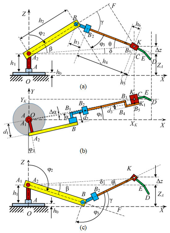 Figure 5 shows the projections of the manipulator: both onto absolute coordinate planes—vertical XOZ, Figure 5a,c and horizontal XOY, Figure 5b. Moreover, projections of two possible configurations of the manipulator are presented on the vertical plane, ensuring that point K gets into the given position. One configuration corresponds to the mechanism approaching point K from above, when the elbow (point B) is located at the top, see Figure 5a, and the other, which corresponds to the mechanism approaching point K from below, when the elbow (point B) is located below, see Figure 5c. Therefore, we will derive the values of the angles at the joints for these two possible configurations of the mechanism. In this case, triangles formed by projections of the corresponding characteristic points of the mechanism onto the indicated vertical and horizontal planes are considered; the names of the projections of the points are preserved by their variable identifiers.