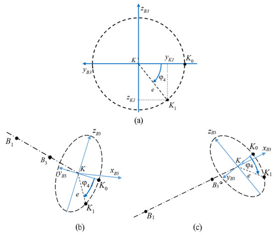 Let us use the third assumption about the position of point K. As in the second assumption, the angle determined by Equation (5) is not enough for point K to take the required position. However, unlike the case of the second assumption, an error appears in the position of point K not only in the direction perpendicular to the vertical plane in which the axis of the column and in which the points A and B are located, but also in two other directions perpendicular to this one. The plane in which the first of these directions is deposited is shown in Figure 5c with a green dotted line. In this plane, the distance d is plotted in the plane perpendicular to the B1B3 axis. Figure 6 shows the trajectory of point K (circle) with a full rotation of the wrist around the B1B3 axis (a) and the position of this point when the wrist is rotated through an angle 4 for the upper (b) and lower (c) configuration of the manipulator.