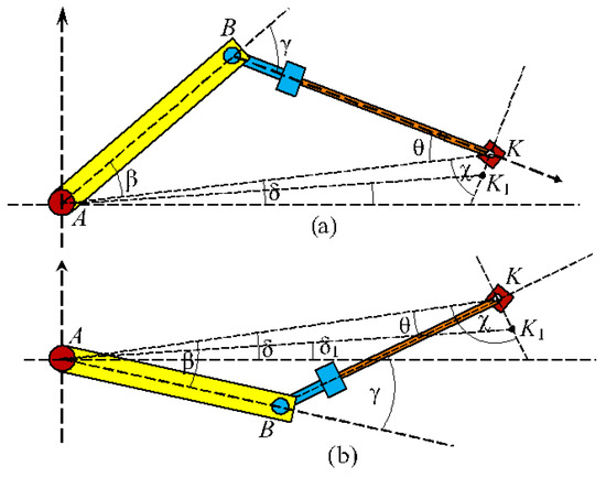 where an algebraic value of the misfire KK1 is determined only by the distance d (together with the sign) since the straight line B1K in this position is parallel to its ideal position when d = 0, see Figure 4b. Then, in the above obtained equations for the angles of rotation of the first three manipulator’s links, only the first angle expression will change, and will take the form