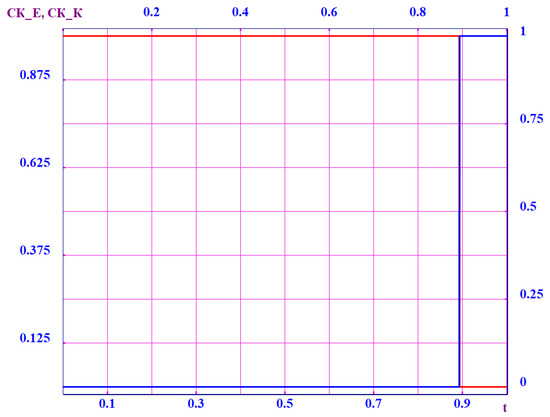 This specification of the tool motion makes it possible to check the performance of the algorithm if the corresponding CSs degenerate when they are in a vertical position above point D of points E and K. Figure 10 shows the switching from the degenerate CS to non-degenerate ones, while the calculated motions of the points are smooth and continuous everywhere. At the initial section, the CS degenerates; therefore, the CS is used.
