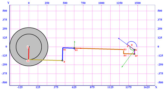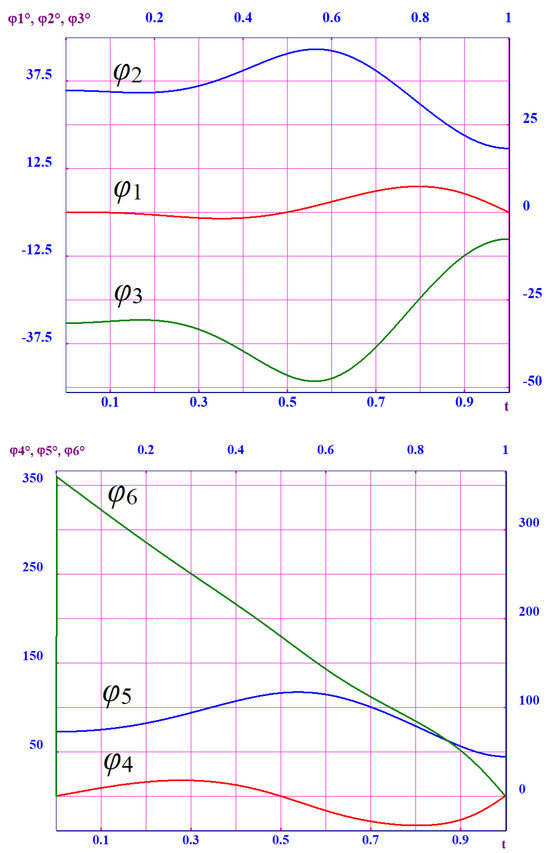 Figure 11 illustrates a frame of animation of the motion of the entire mechanism (top view) when drawing the trajectories of points E and K. Figure 12 shows the laws of angles varying in the hinges of the mechanism calculated by the algorithm for solving the inverse kinematics problem to carry out a given motion. In this case, the maximum error in the coordinates of points K, E, D did not exceed 1 · 10−11 mm.