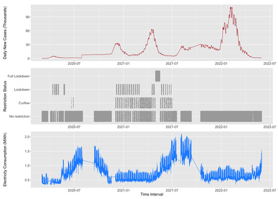COVID-19 daily new cases, restriction status, and electricity consumption versus time plot between 1 March 2020 and 1 June 2022.